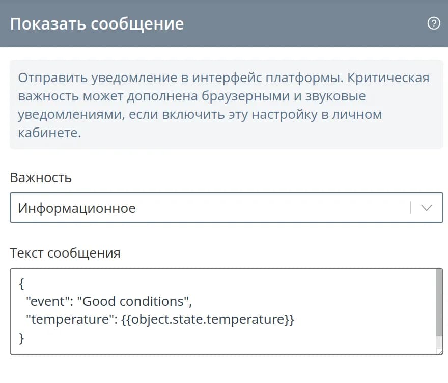 Помимо описательной информации о произошедшем событии, в сообщении можно отправить конкретные текущие значения параметров. Все значения, которые можно использовать, указаны в API link объекта.