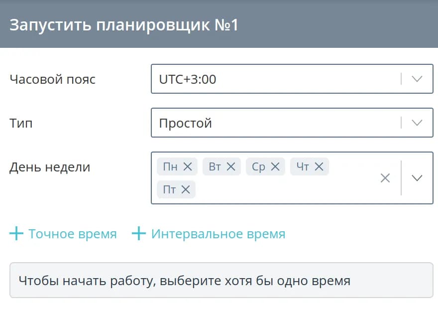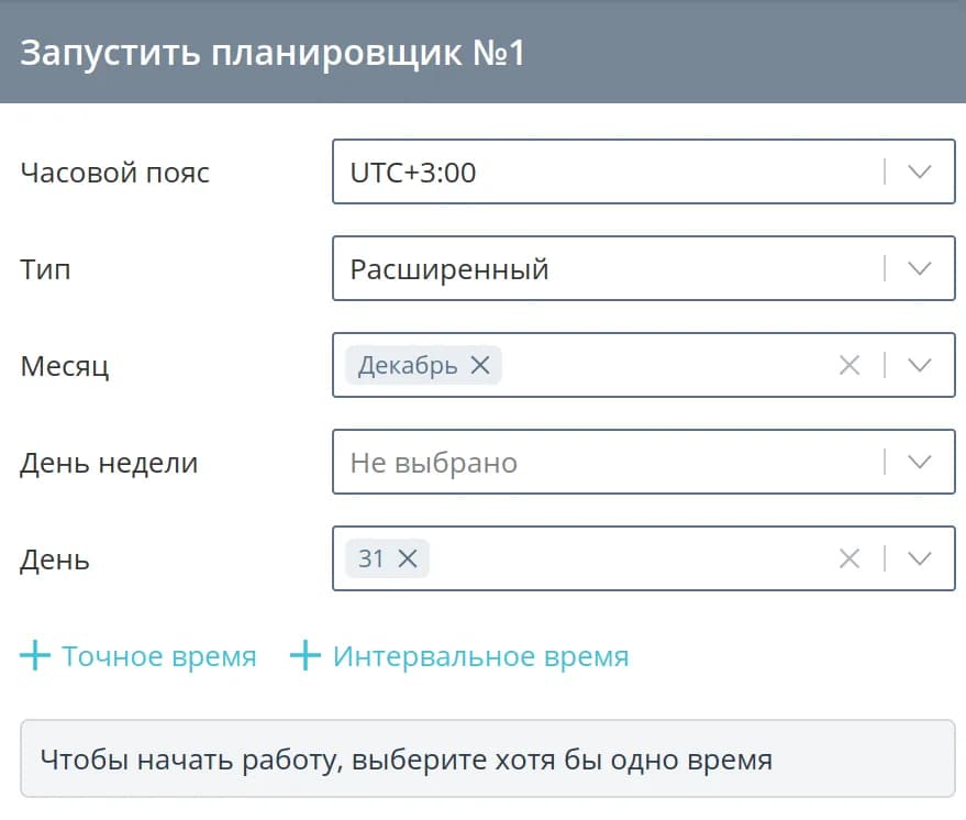 Интервальное время - позволяет выбрать промежуток времени и периодичность срабатывания в рамках этого интервала (например, если вы выберете промежуток с 13:00 по 14:00 и интервал Каждые 2 минуты, то планировщик сработает в 13:00:00, 13:02:00, 13:04:00, …)