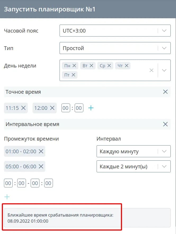 Для проверки ближайшего времени срабатывания планировщика нажмите кнопку Узнать. Это поможет вам проверить корректность составления сложного планировщика.