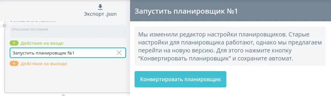 Если в ваших автоматах были ранее созданы планировщики в старом интерфейсе, они продолжат работать без изменений, однако не будут отображаться в текущем интерфейсе настройки планировщика. Поэтому рекомендуется провести конвертацию в новый интерфейс, нажав кнопку Конвертировать планировщик.