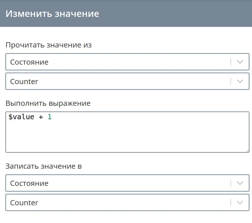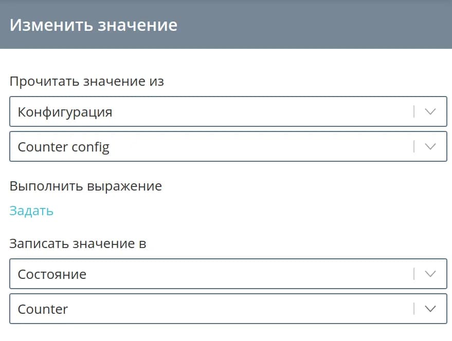 Если в ходе выполнения логики автомата необходимо изменять или заполнять значение каких-то параметров состояния, конфигурации или статуса, воспользуйтесь командой Изменить значение.