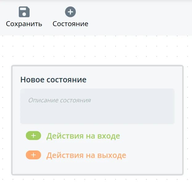 Состояние: В нем указываются действия, которые должны быть выполнены на входе и выходе