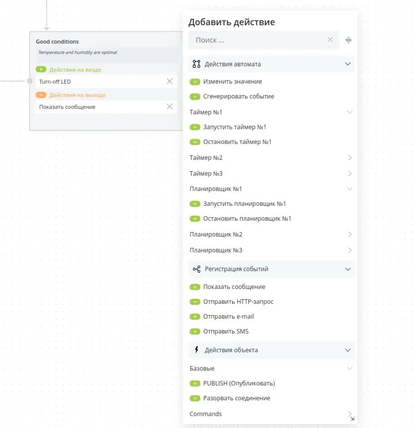 - Действия объекта - команды, которые можно отправить на объект: