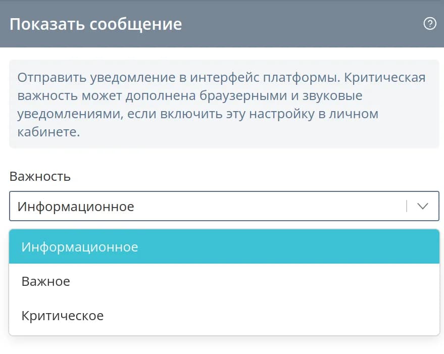 Для формирования сообщения добавьте в состояние команду Показать сообщение. Справа появится боковая панель, на которой выберите степень важности сообщения: