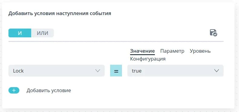 Для формирования условия выберите параметр модели, значение которого необходимо проверить, из выпадающего списка.