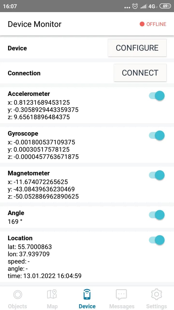 In the Device menu you can connect your mobile device to the project as a monitoring object. monitoring object. Fill in the name of the object and the frequency of sending data from the sensors built into the phone, and then the screen for selecting the required parameters will appear. parameters. Press CONNECT button.