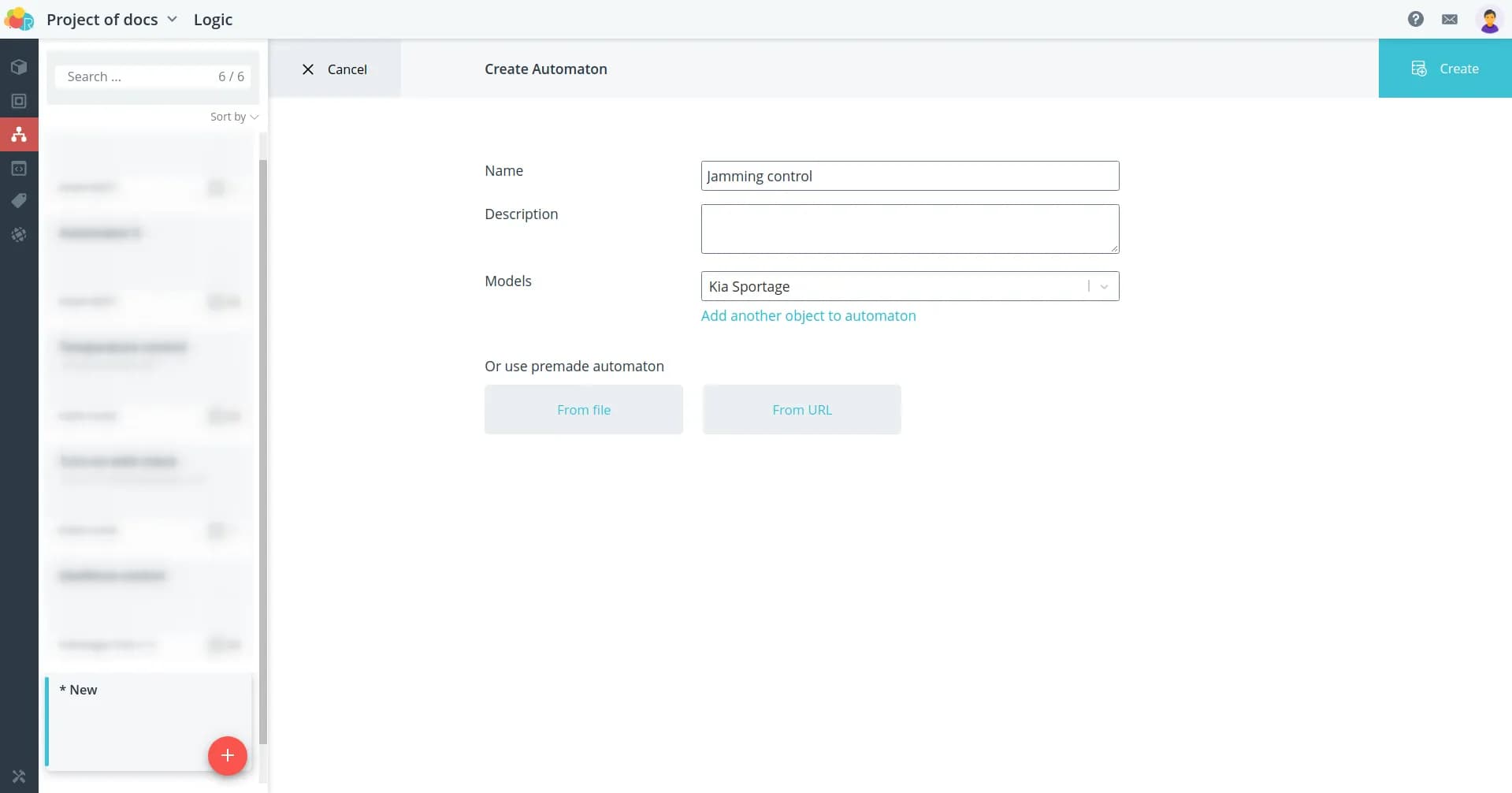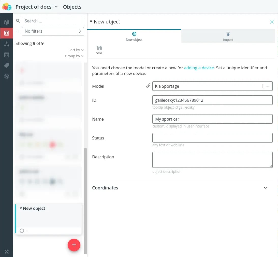 Create an object for your vehicle. Select the model you just created. Then enter the identifier corresponding to the IMEI of the terminal, with the prefix galileosky:. Specify a name for the object.