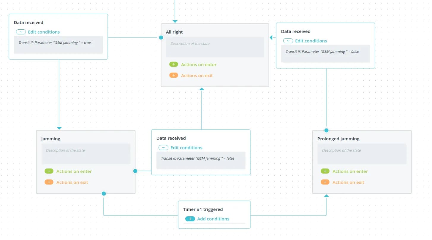 Now define what actions should trigger in the states. In normal mode of operation you can do nothing. In silencing mode, you need to start a five-minute timer. If during the time until the timer is triggered, a value comes in, that there is no silencing, then the dispenser will go to the normal operation mode without sending the notification. notification.