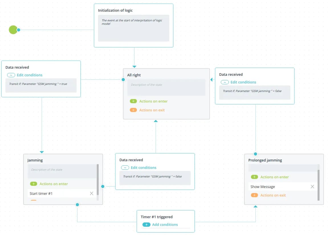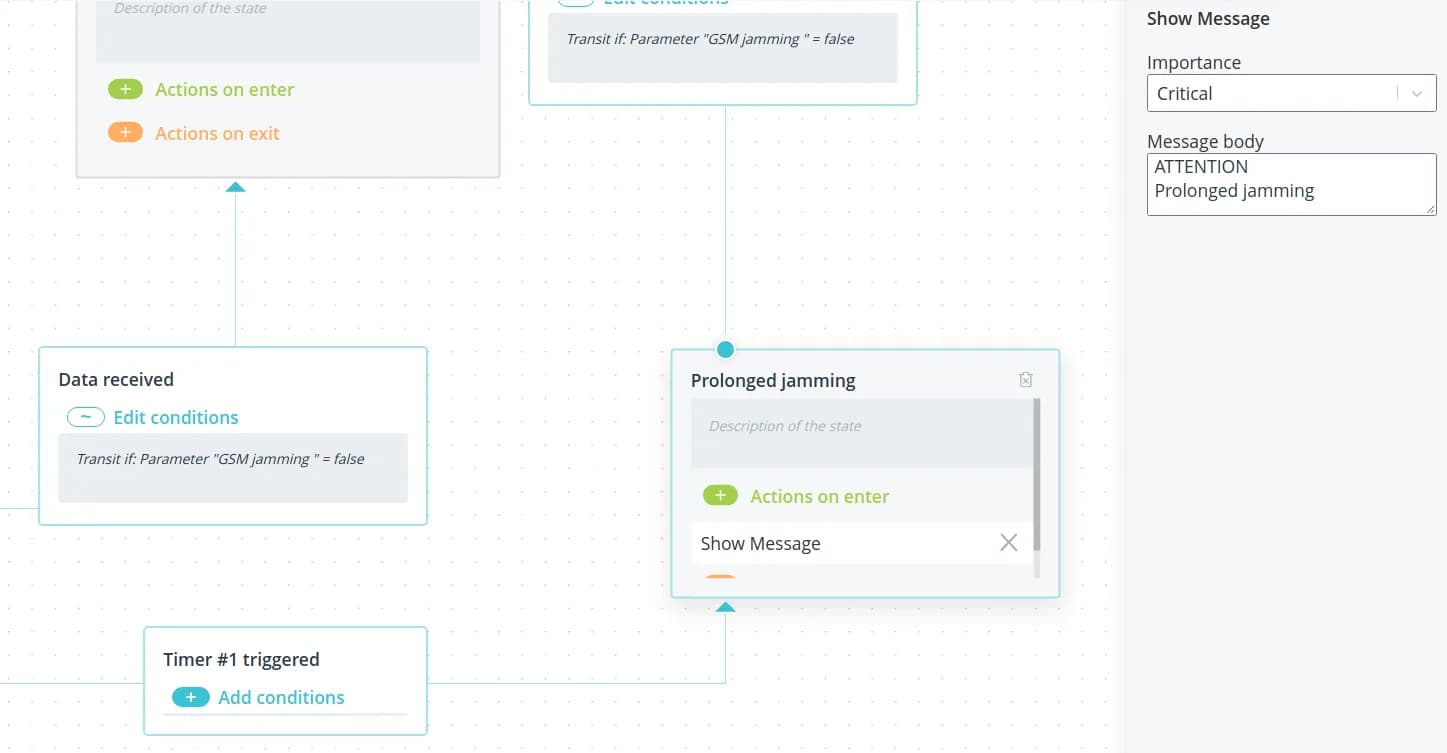 Task: Assume that the GSM Silencing parameter is to be monitored. It is allowed that the signal can be lost for up to five minutes in normal situation. If the jamming sensor does not go to the normal state for longer than five minutes, it is necessary to send a notification to the platform.