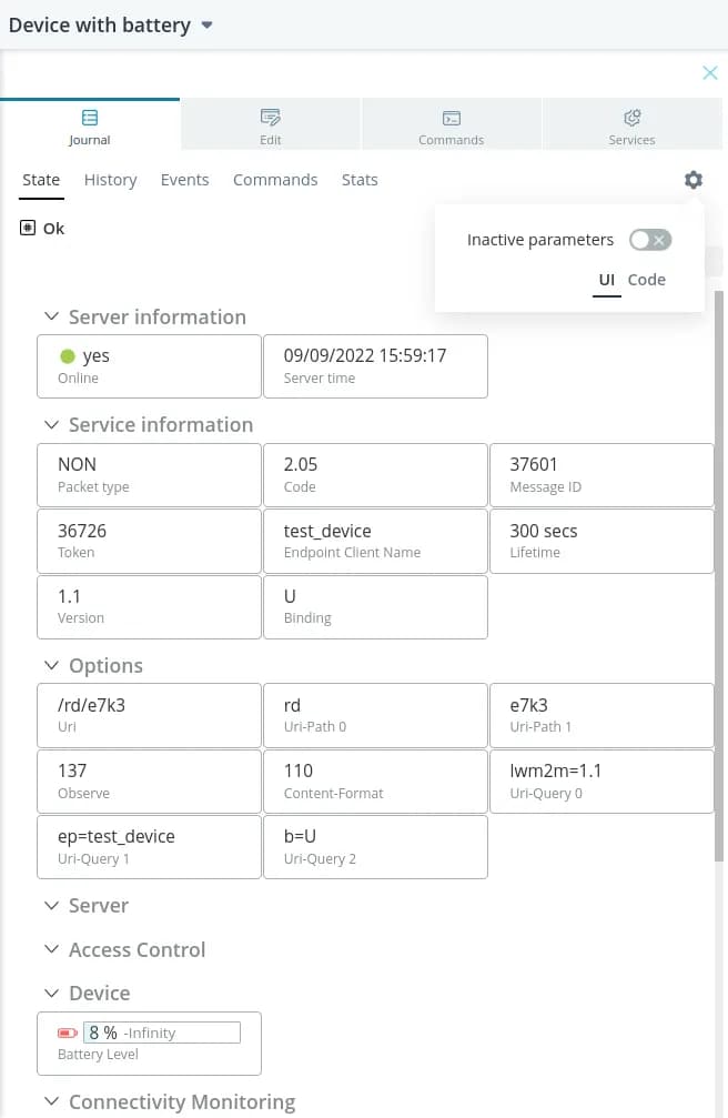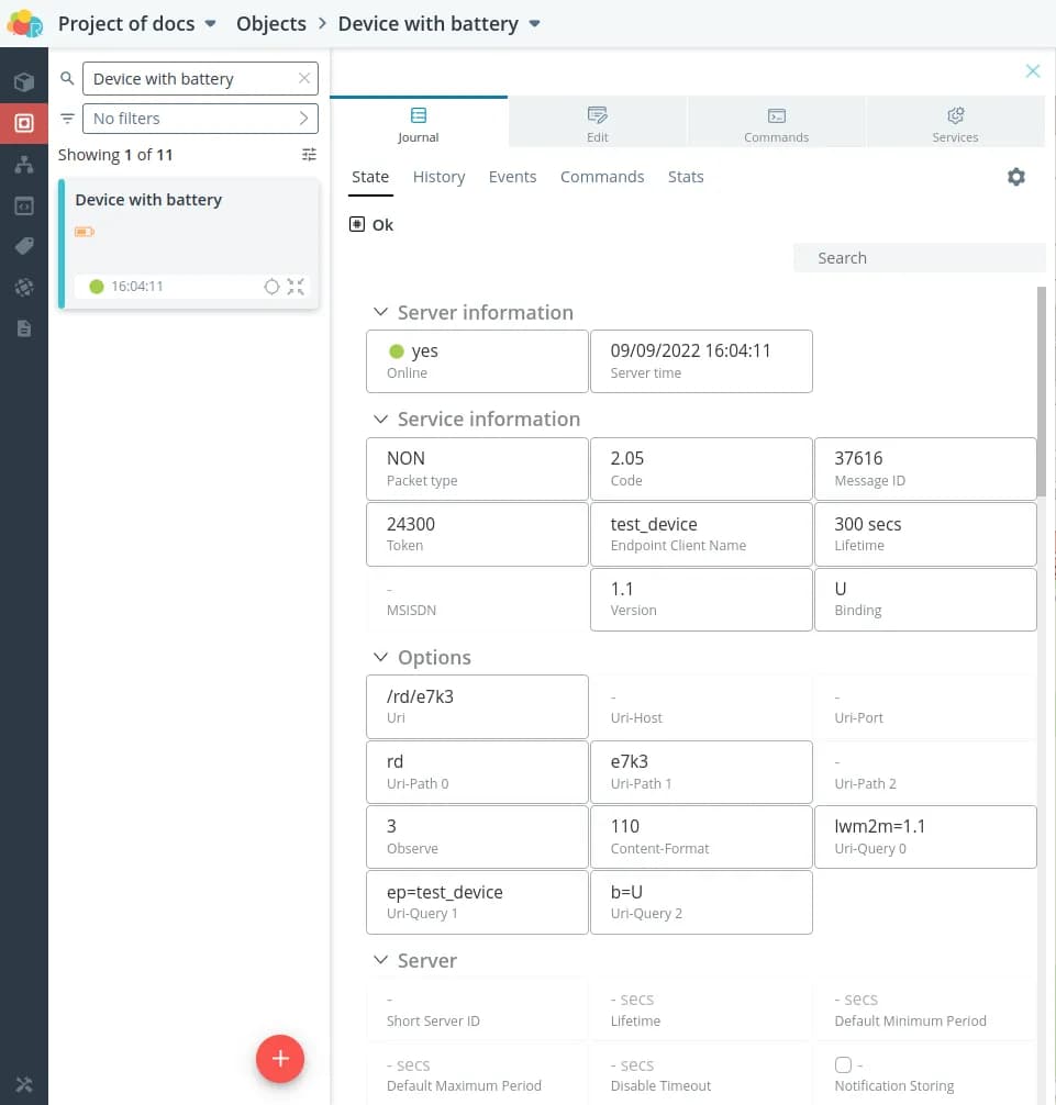 > ./lwm2mclient -4 -h dev.rightech.io -n test_device -cMake sure the data from the device is sent and displayed in the interface.