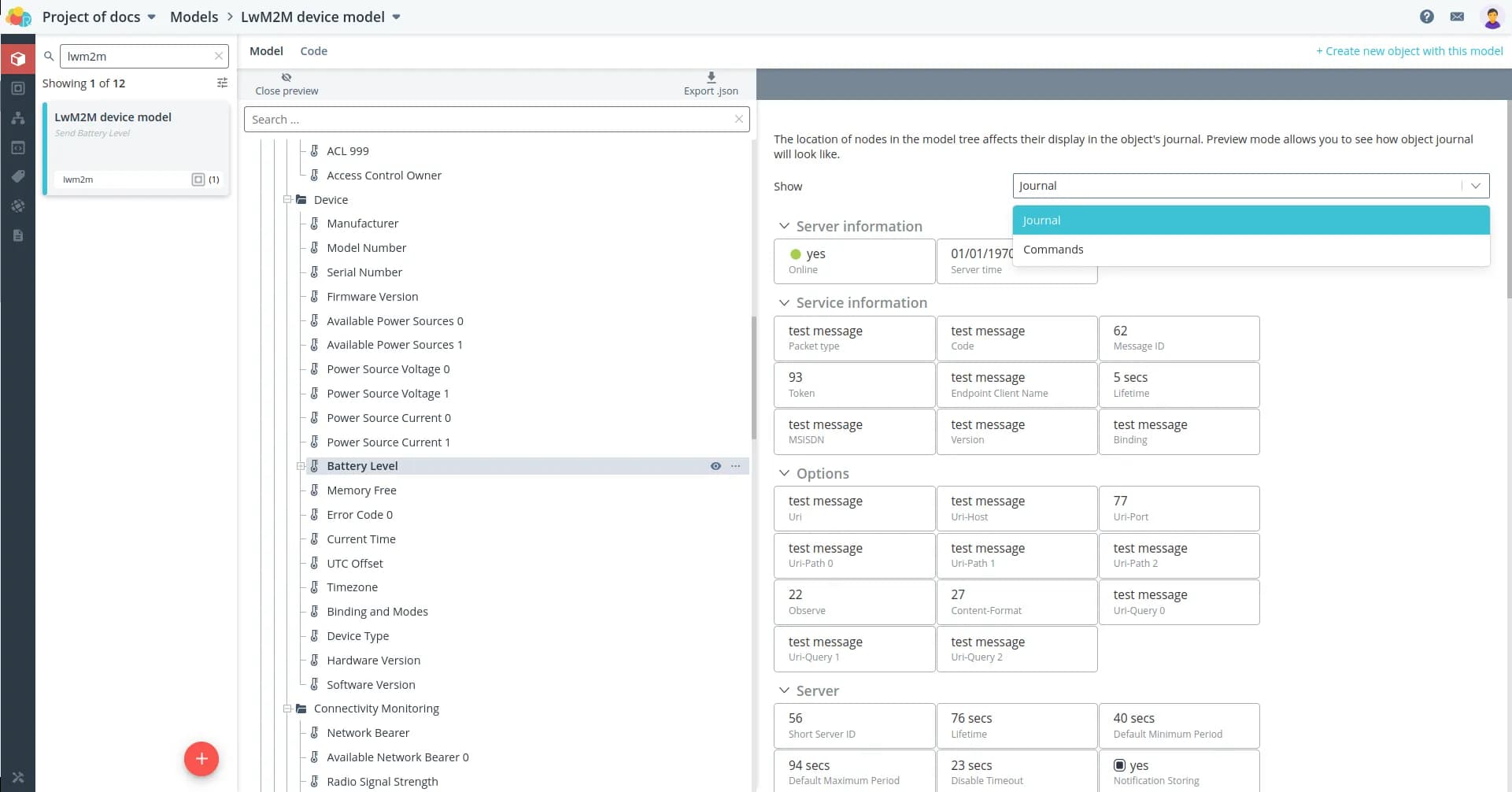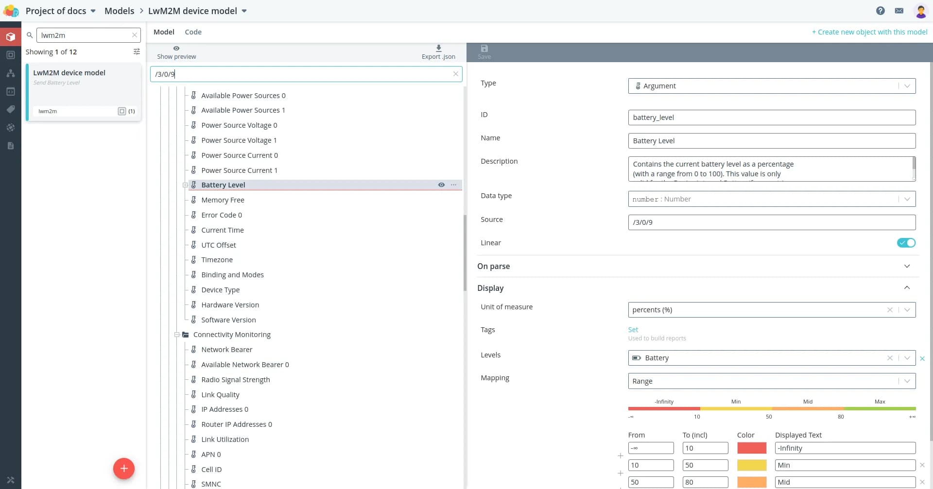 Problem: Suppose you have a device that transmits battery level data via the LwM2M protocol. According to the documentation in the package, the battery level information is on the path /3/0/9: