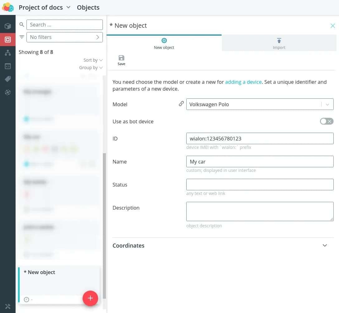 Create an object for your vehicle. Select the model you just created. Then enter the identifier corresponding to the IMEI of the monitoring unit, with prefix wialon:. Specify the name of the object.