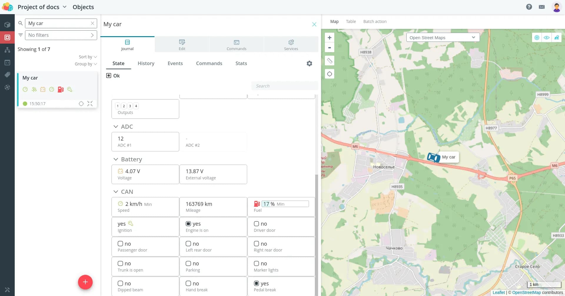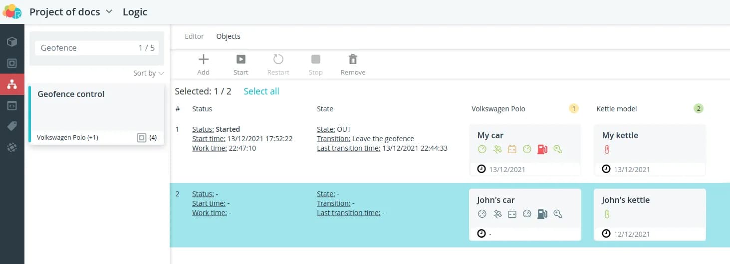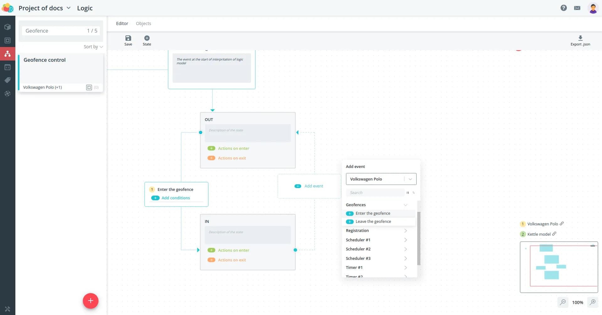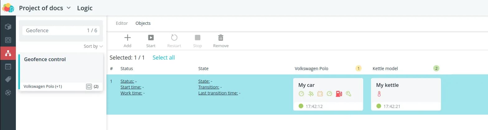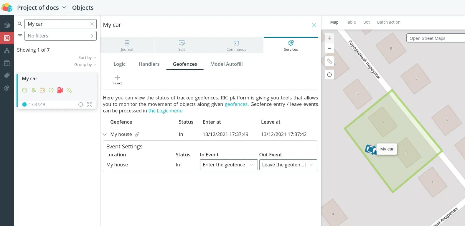 Add a geofence to the vehicle object. After receiving the actual coordinates you will see the status of being in the In/Out geofence. Here you can also see the events that are generated on entry and exit. These are the ones that were used in the the automaton.