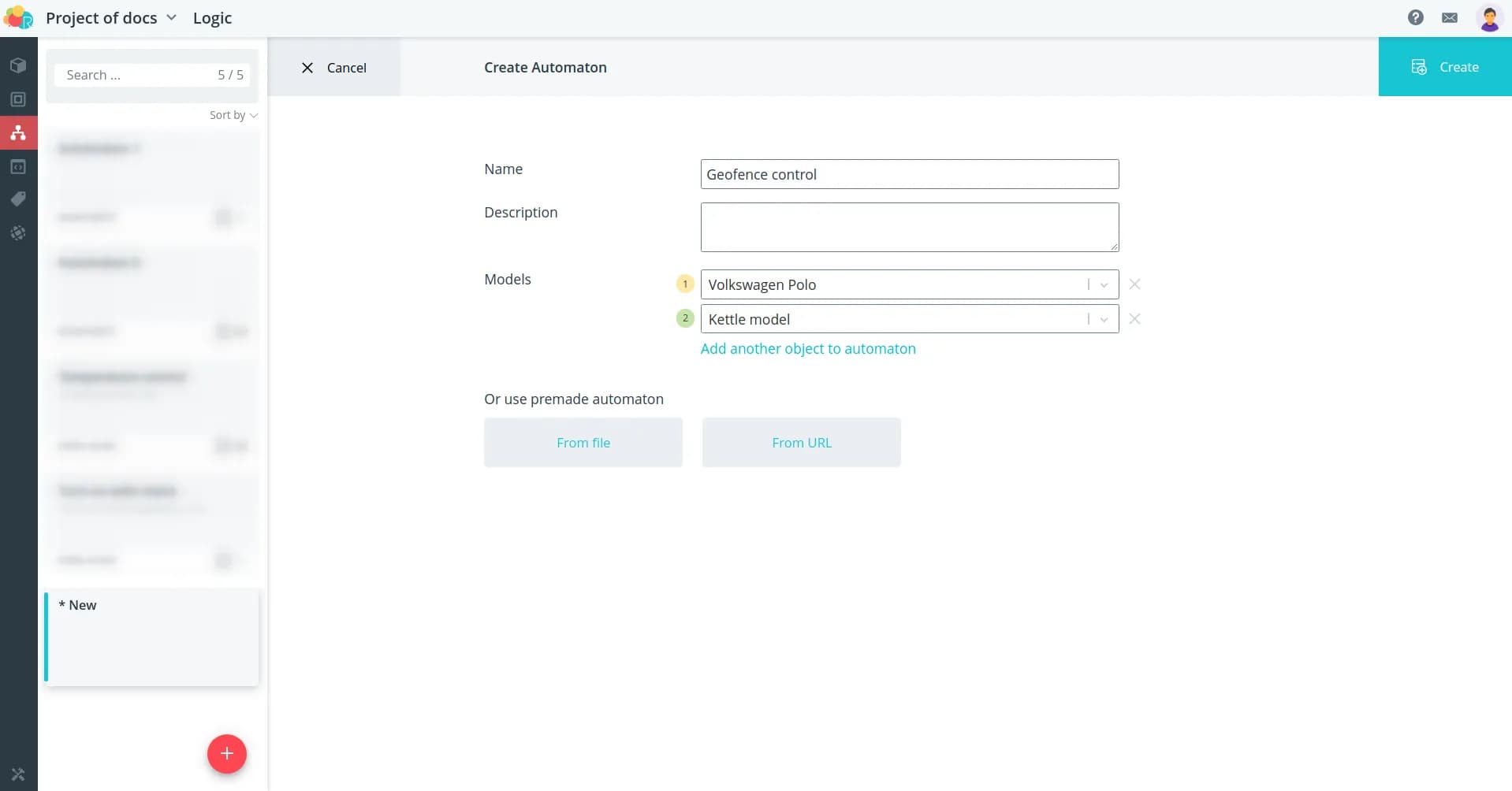 Create a new automaton. Choose two models: a kettle and a car, as the automaton will organize interaction between two objects with these objects. automaton will organize interaction between two objects with these models. models. Events will come from the car, and commands will be sent to the kettle.
