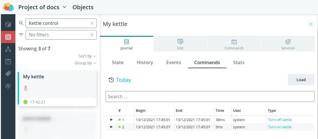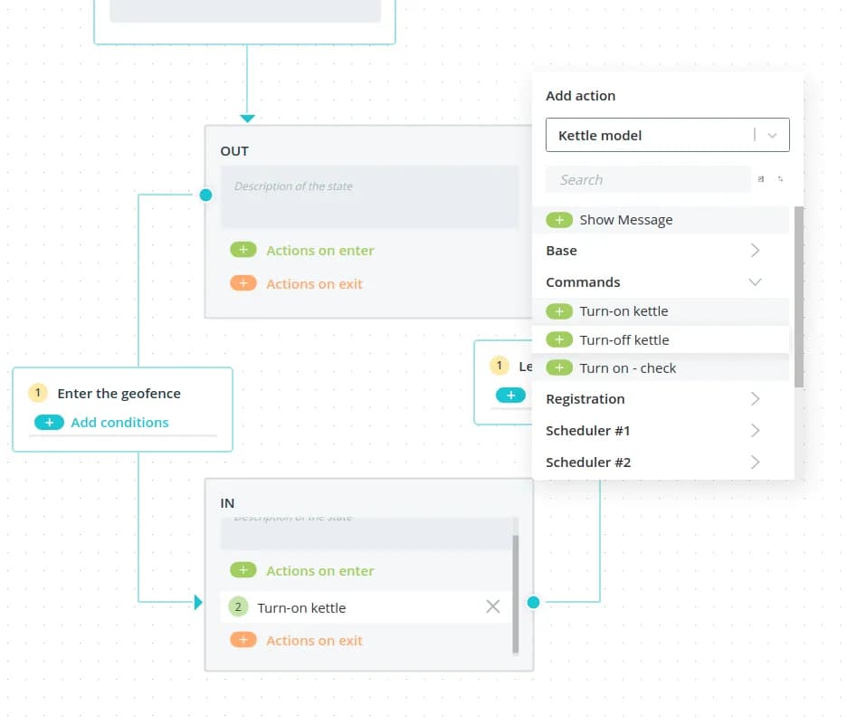 Now add commands that will be executed in the states: turning the kettle on and turning the kettle off. Note that when selecting actions, the kettle model must be active. model of the kettle, since the commands will be sent to it.