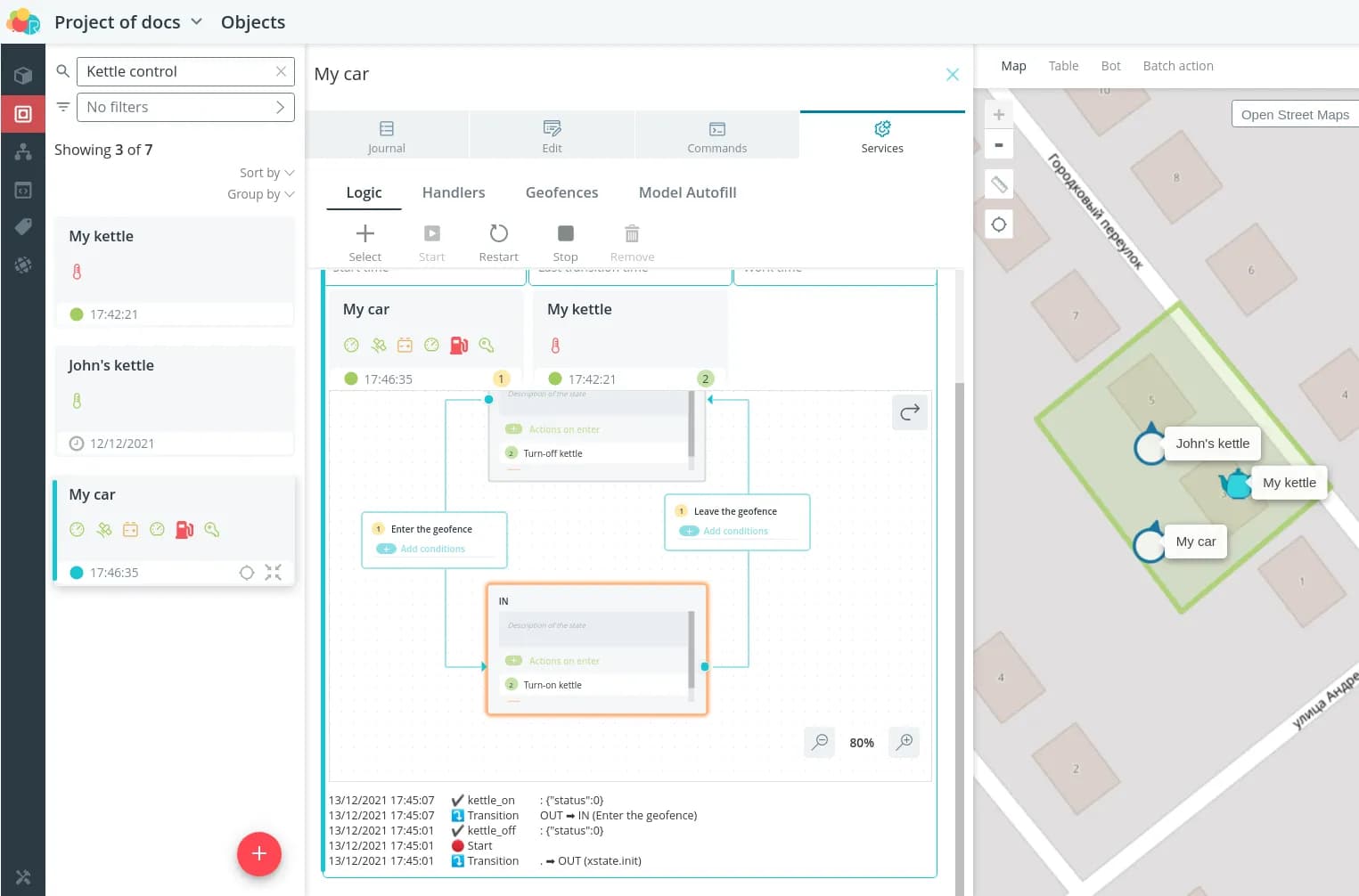Problem: Suppose that the kettle from the MQTT example needs to be turned on and off automatically when you come and go from home. So, you need to implement in the automaton the control of entry/exit from some geo-zone defined by the area around the house. Then, as soon as the car enters this geofence, the kettle will turn on, and hot tea will be waiting for you at home. And if you drive away, the kettle will turn off if it is suddenly left on.