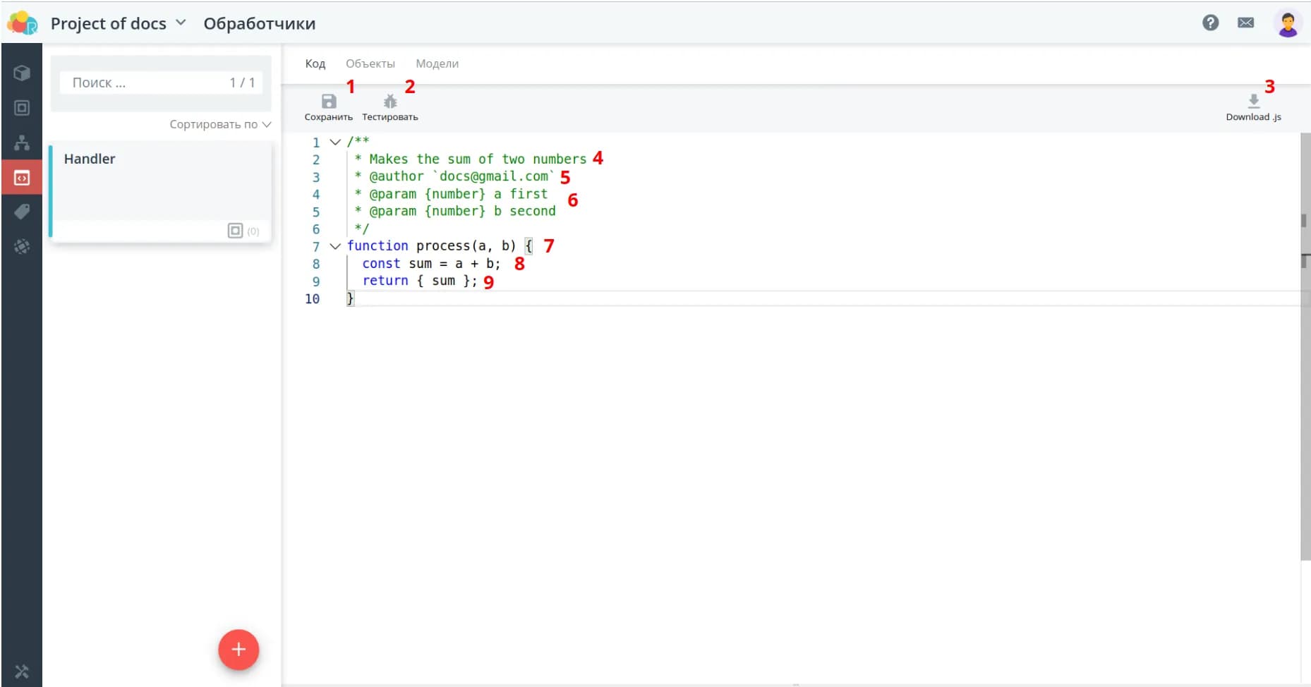 Click the Create button. A ready template will open in front of you with a small code for calculating the sum of two input values. code to calculate the sum of two input values. Use it as a as an example of how the handler can be implemented.