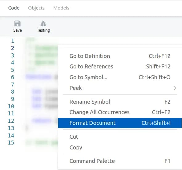 }When developing large and complex code, take advantage of the additional You can open the list of additional features by right-clicking in the code area of the handler. in the code area of the handler. For example, there is a function of code auto-formatting.