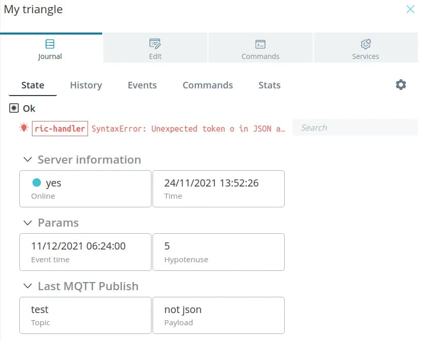 If an error occurs during the execution of the handler, you will immediately you will immediately see it in the object's interface. It is displayed in the form of text with an icon red light bulb.