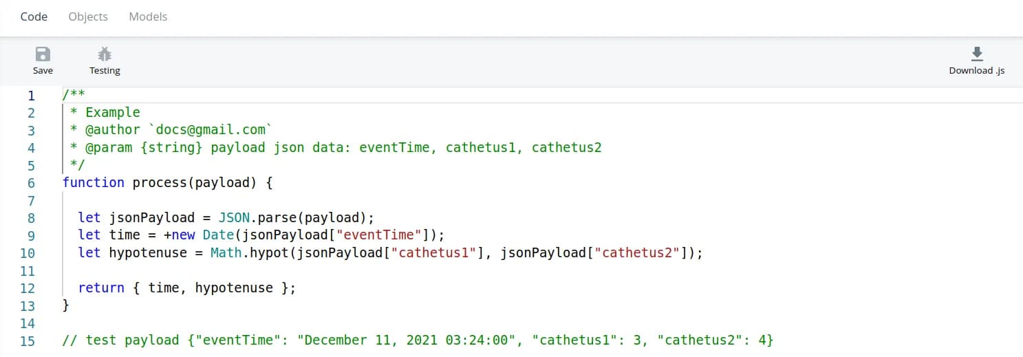 To export the handler, click on the Download .js button. You will get a file JavaScript (.js) file that you can run locally for tweaking and testing. testing.