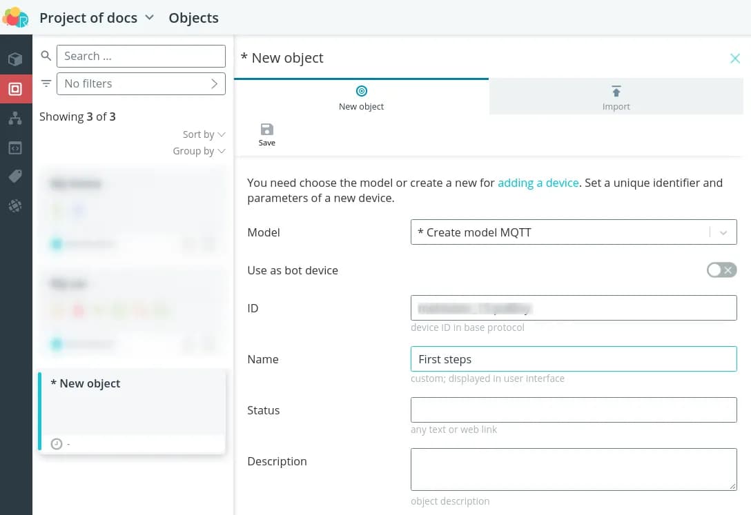 Select Create MQTT model as the model, the identifier can be you can leave the identifier generated by default, set the name of your object.