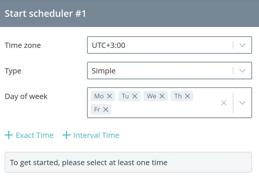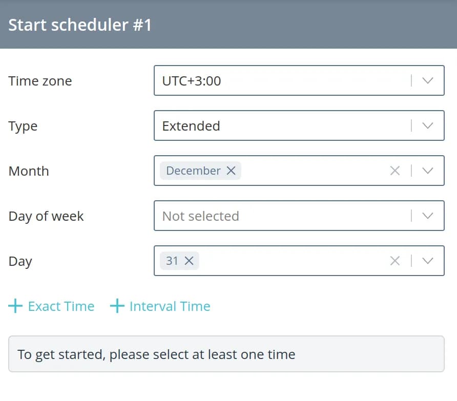 Interval time - allows you to select a time interval and periodicity of triggering within this interval (for example, if you choose the interval from 13:00 to 14:00 and the interval Every 2 minutes, then the scheduler will trigger at 13:00:00, 13:02:00, 13:04:00, ...)