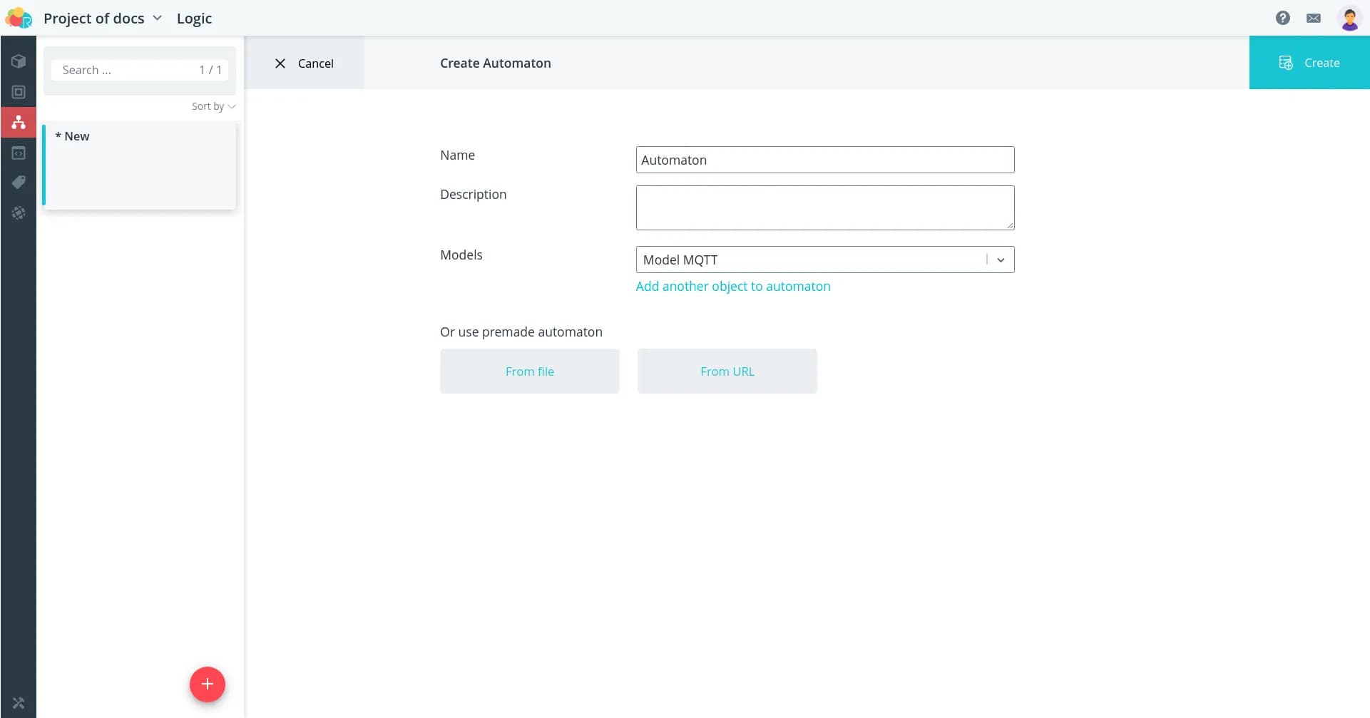 Click the Create button. A new automaton will open in front of you with minimal set of elements in the working area.