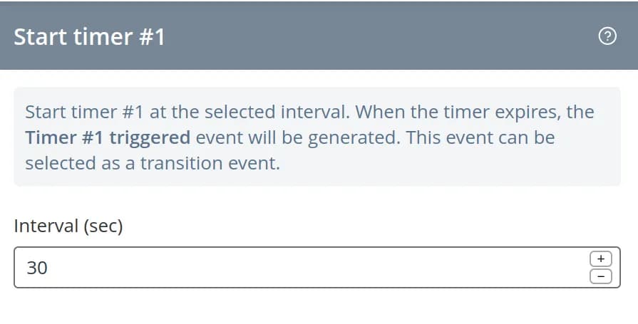 Start timer allows you to configure an event to trigger after a certain time. specified time. To set the time, add the command to the state Start Timer. A sidebar will appear on the right side of the screen, in which type a number, the number of seconds the timer should be triggered.