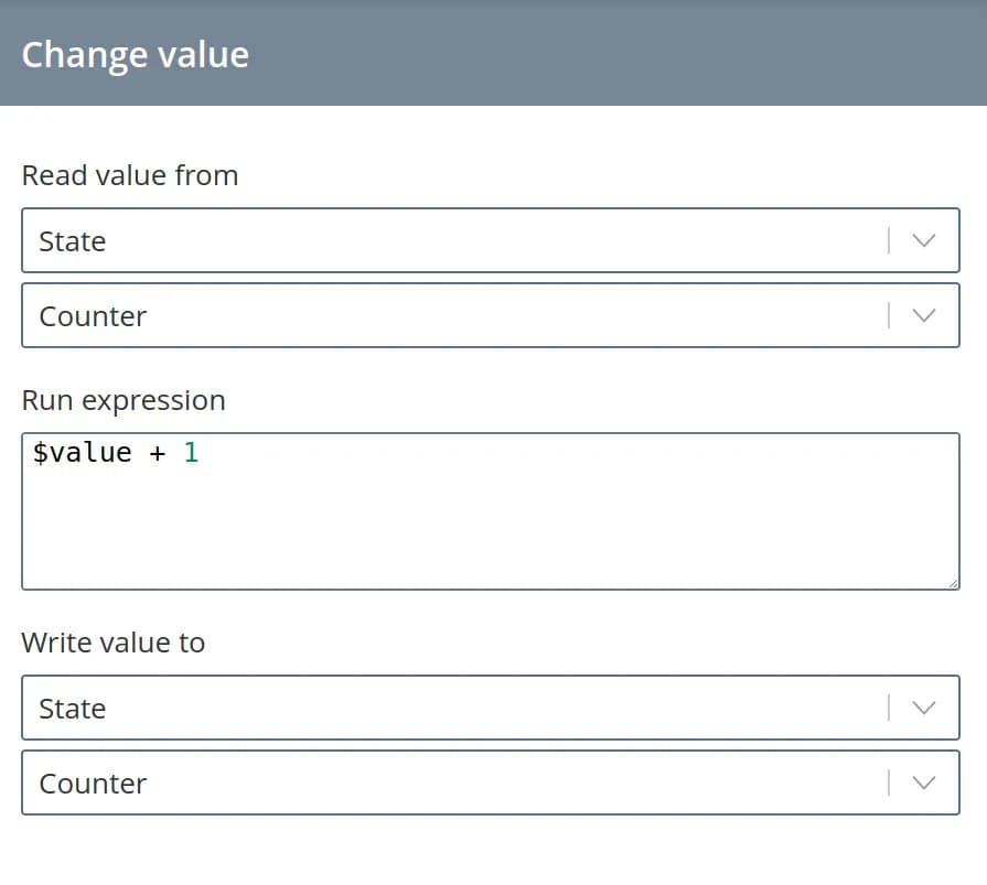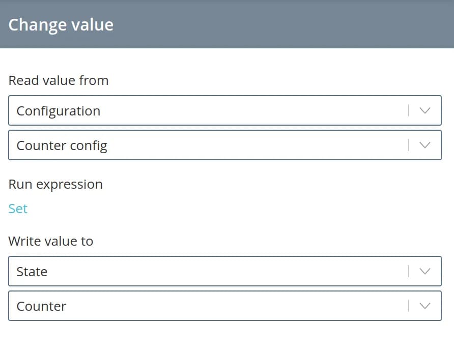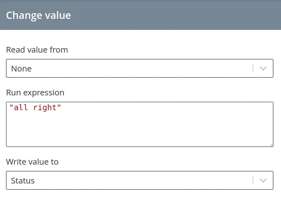 - read a parameter from the configuration/state/status, perform some expression on it some expression (the read value is used in forming the expression in the form of $value variable) and write the obtained value to the parameter from configuration/state/status;