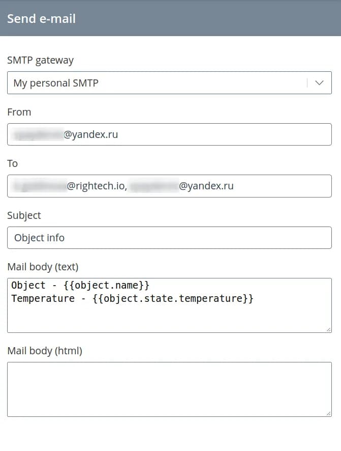 If in the course of execution of the automaton logic it is necessary to send e-mails to certain addresses, use send e-mail. In order to customize the sending parameters, add the Send e-mail command to the state. A sidebar will appear on the right side, where you should fill in the following fields: