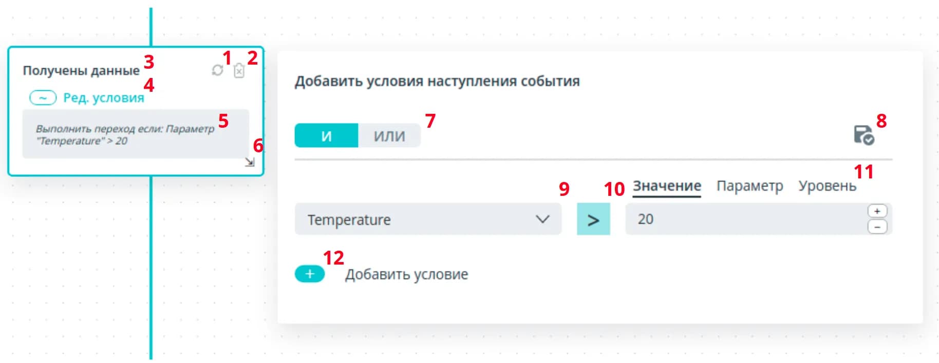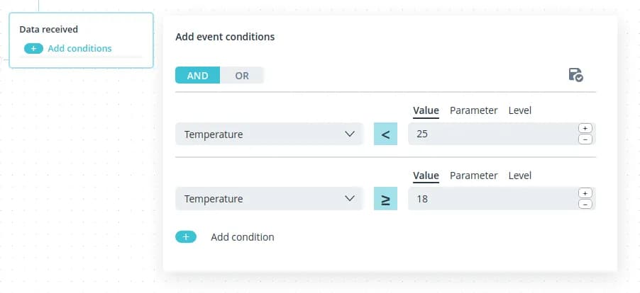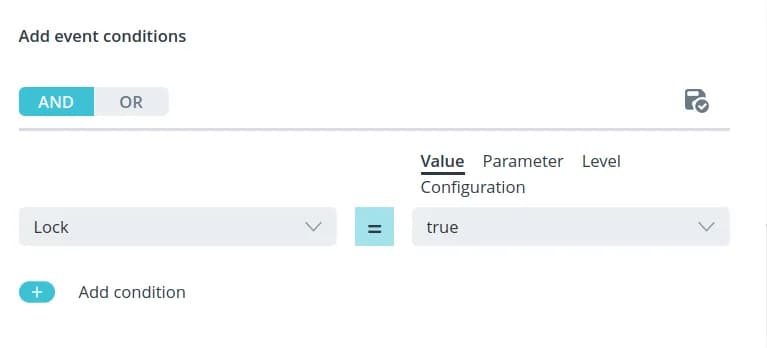 Select the comparison operation and after the condition is generated, click the save button in the upper right corner of the Add Condition window.