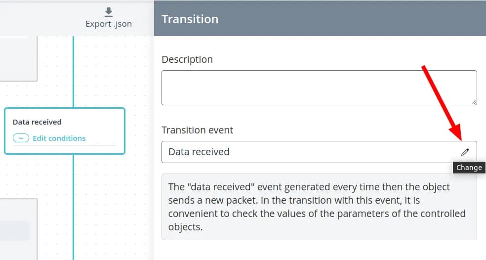After selecting an event, you can additionally specify a condition, when it is fulfilled. when the transition takes place.