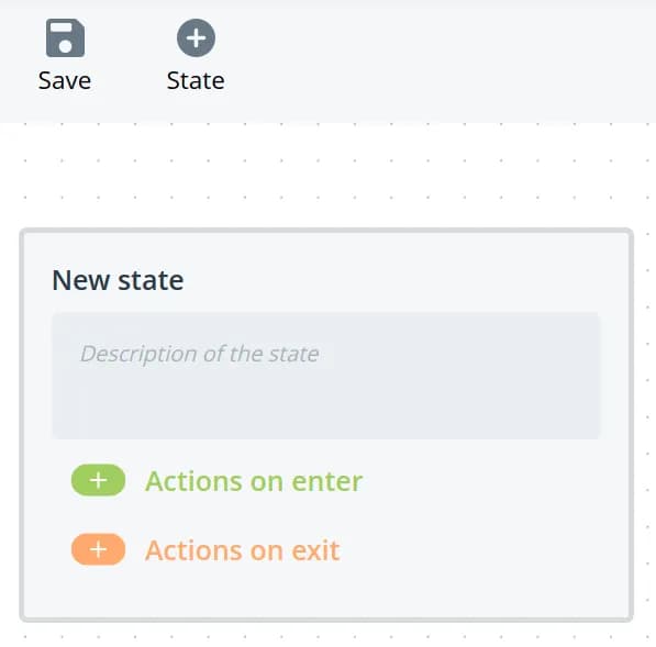 To add an action to a state, define when it should be to be performed: at the input or at the output. After that, click on the corresponding button to open a complete list of actions according to the defined model. This list includes both the actions defined for each model and the commands you have added. as well as commands that you have added. From this drop-down list, select one or more commands to be executed on the input or output of the state.