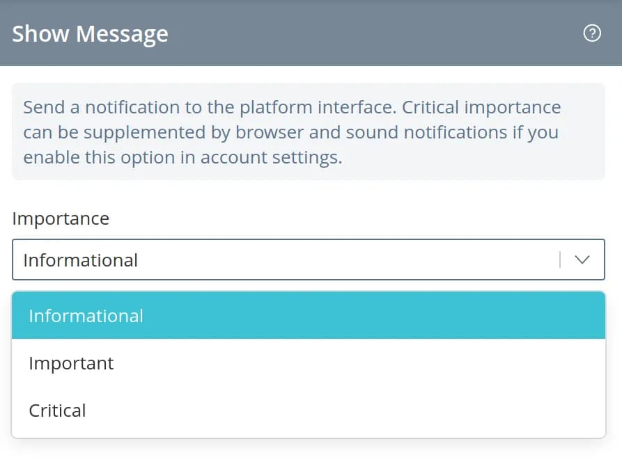 To generate a message, add the Show Message command to the status. A sidebar will appear on the right side, where you can select the importance level of the message: