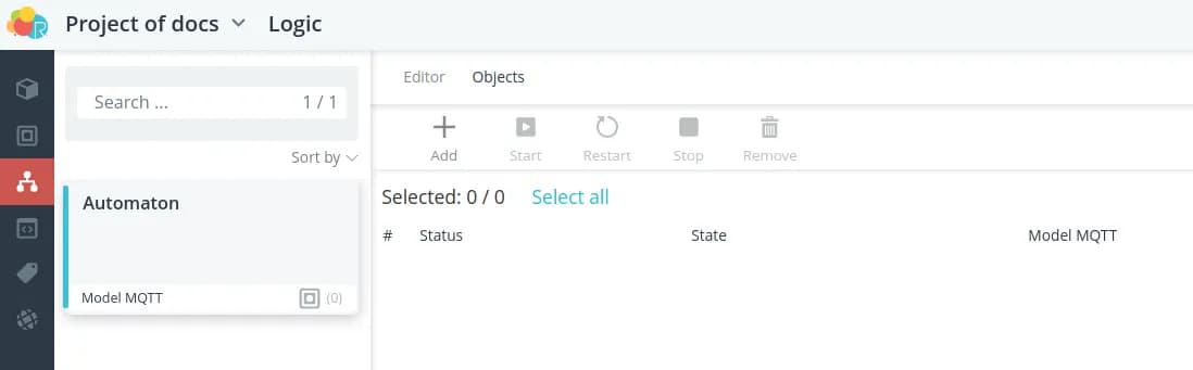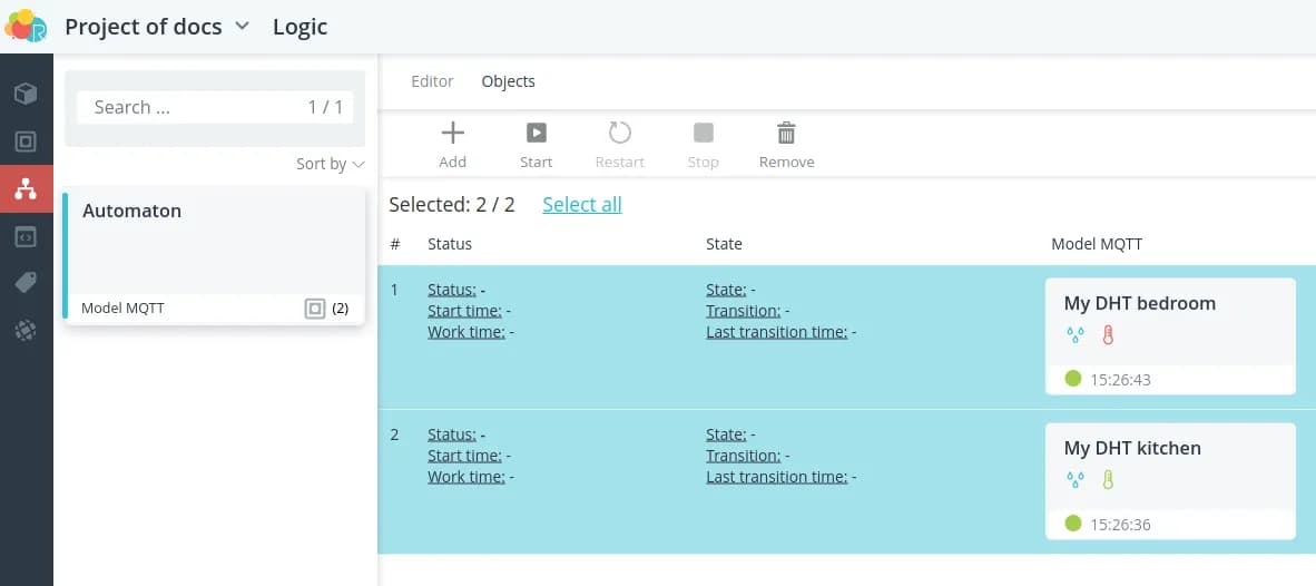 Now the Stop and Restart buttons are available for objects with a running automaton. Stop. The Stop button will stop execution of the automaton. Button Restart button is similar to the Stop and Start buttons and is used for restarting the automaton after making a deposit. to restart the dispenser after changes made in it.