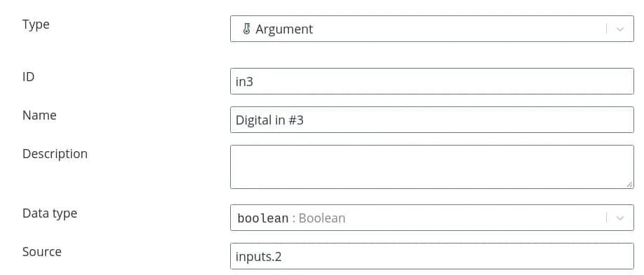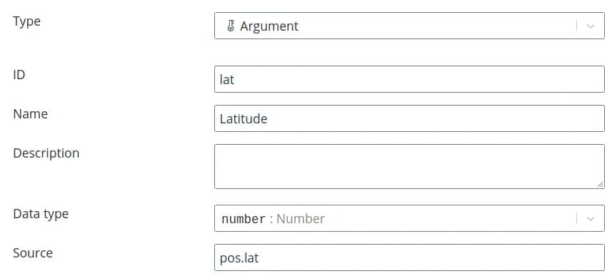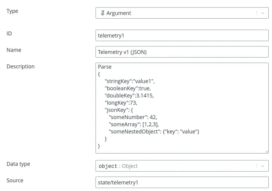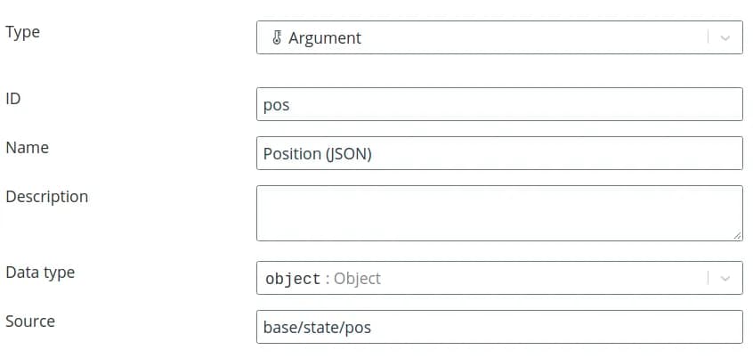 - Create an argument with the Object data type, specify in the source the topic, for which you expect data - in this case base/state/pos. Set some identifier - for example, pos.