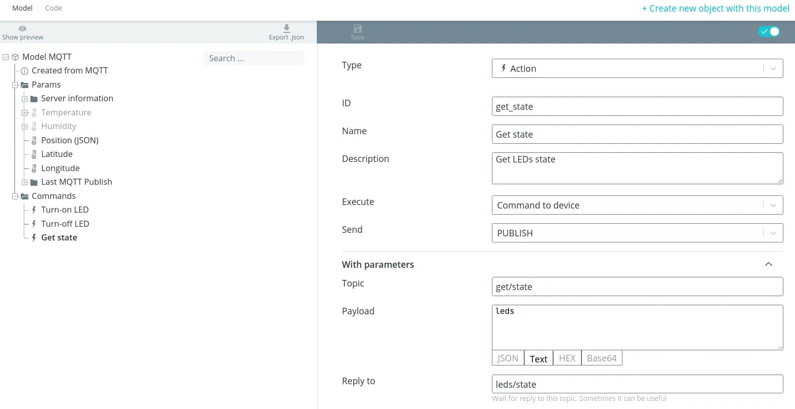 Reply to - the topic, upon receipt of a packet with which the command is considered to be executed. As an option, you can create a command to get the state of the device and specify in the Reply to field the topic, by which the device sends its state - for example,