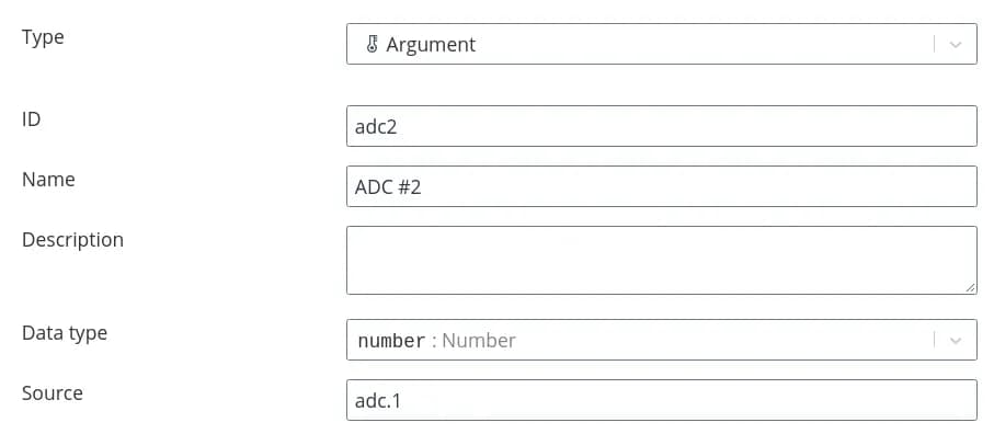 Similarly get individual elements from an array. For example, the parameters of the analog inputs come in the adc array. Then, to output the value of ADC2, specify adc.1 as the source in the corresponding parameter (do not forget about the counting from zero).