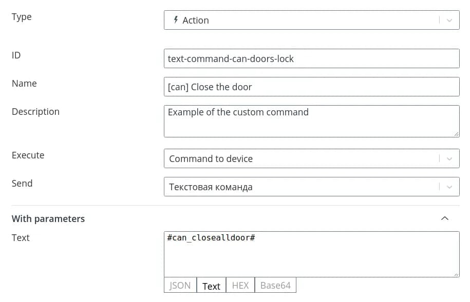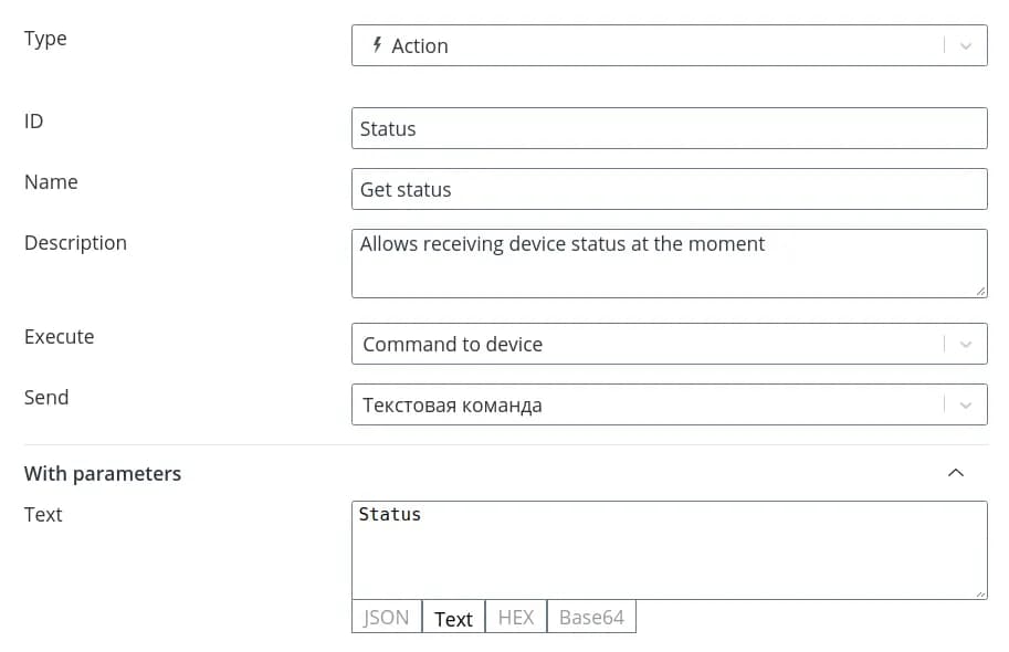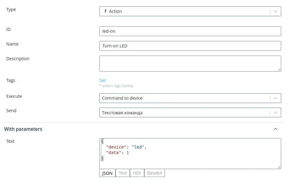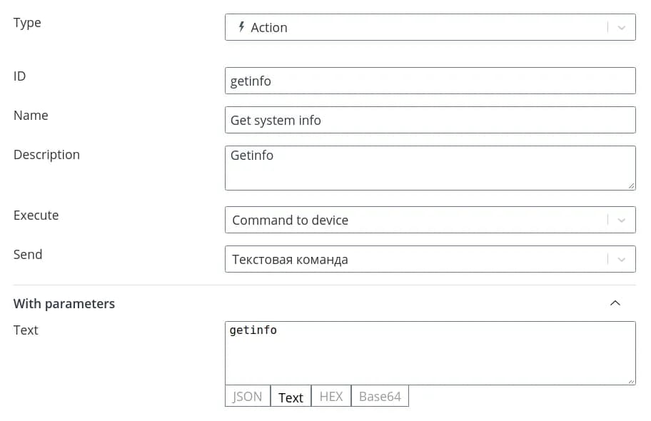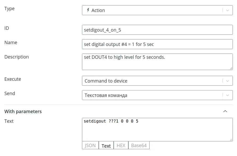 In the case of Galileosky, when filling out an action, in the Send field, select Text command. Then specify in the Text field the command to be sent to the device. you want to send to the device.