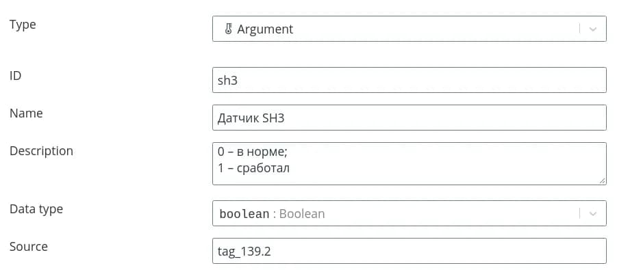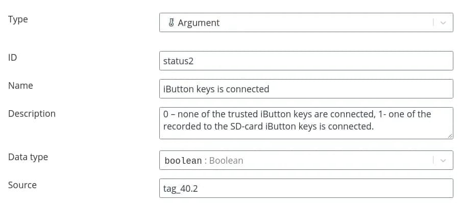 In the case of Galileosky, the data source for an argument is the number of the tag being used according to the exchange protocol. It is formed according to the following principle: tag\_<the parameter tag from the protocol>. If from the parameter on the specified tag to take a certain bit. take only a certain bit, then specify the number of the bit with a period: .< bit number bit number>. For example, tag_40.2 is the third bit (counting from zero) in parameter 40.
