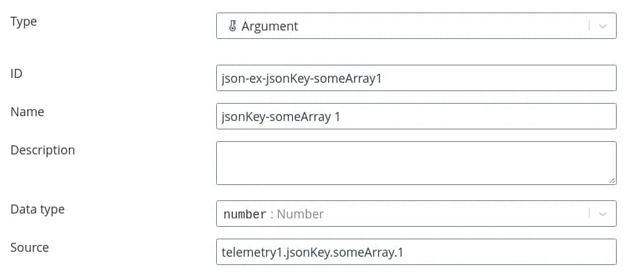 For each of these parameters, specify a data type that corresponds to the type of these values in JSON. Form the source of each of the nodes in the form of <identifier_of_node_with_type_object>.<necessary_field_from_json>. If you want to take only an element from array you want to take only an element from the array, then specify its serial number with a dot: .<number of the array element>. For example, someArray.2 is the third element of the array in the someArray field (counting from zero).