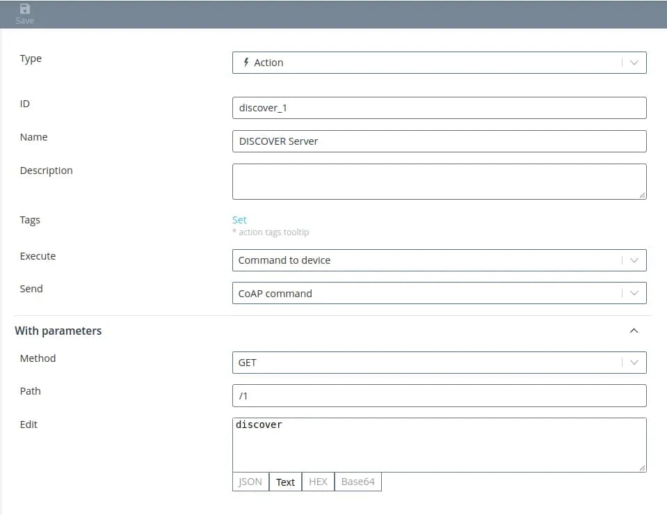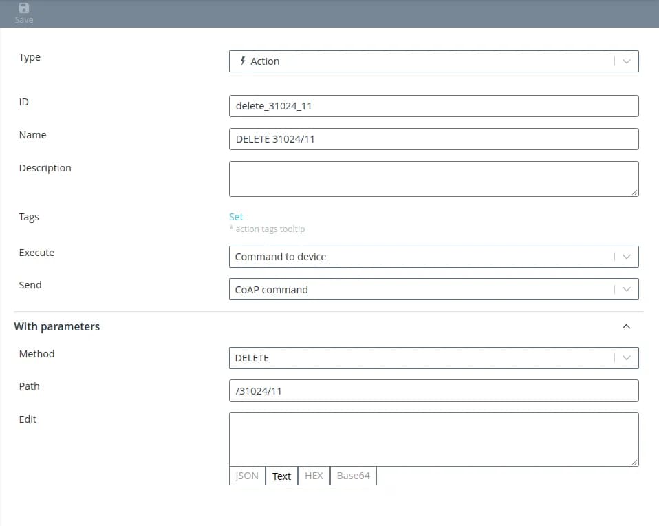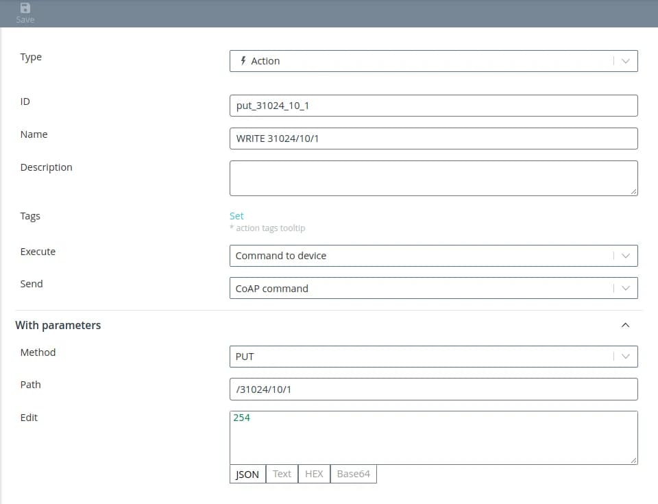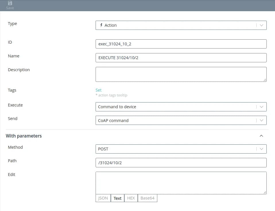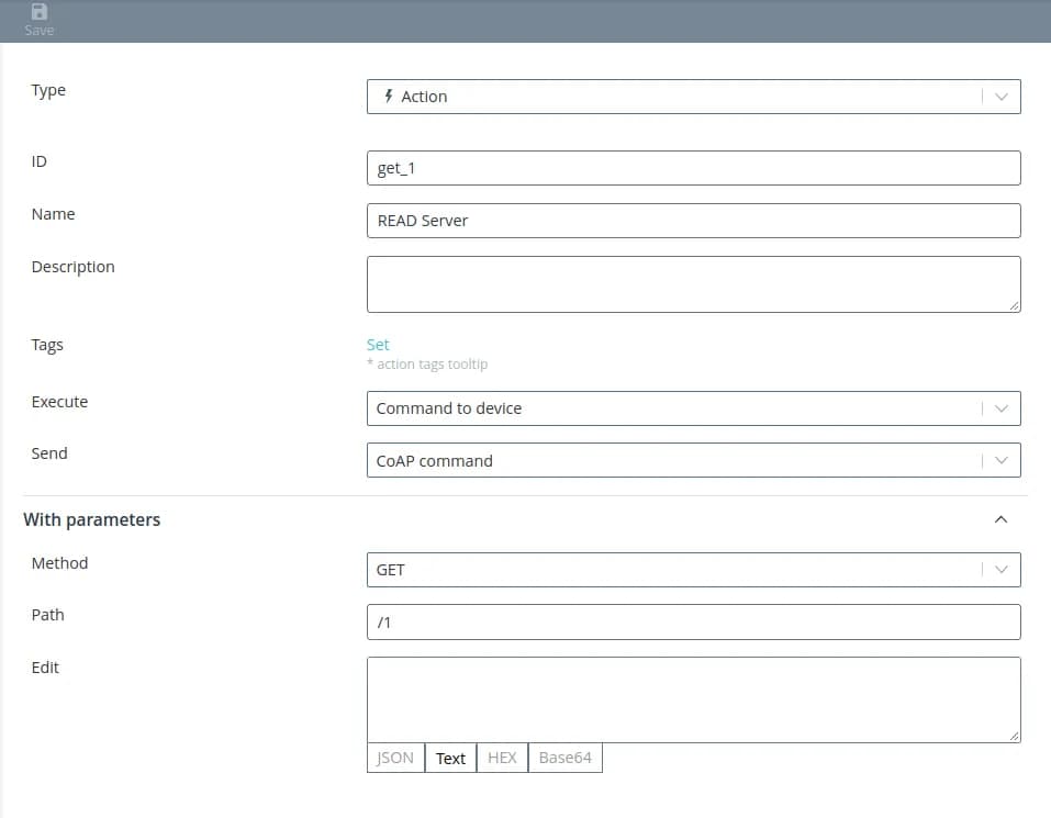 In the case of LwM2M, when completing an action, select CoAP in the Send field command. After that specify: