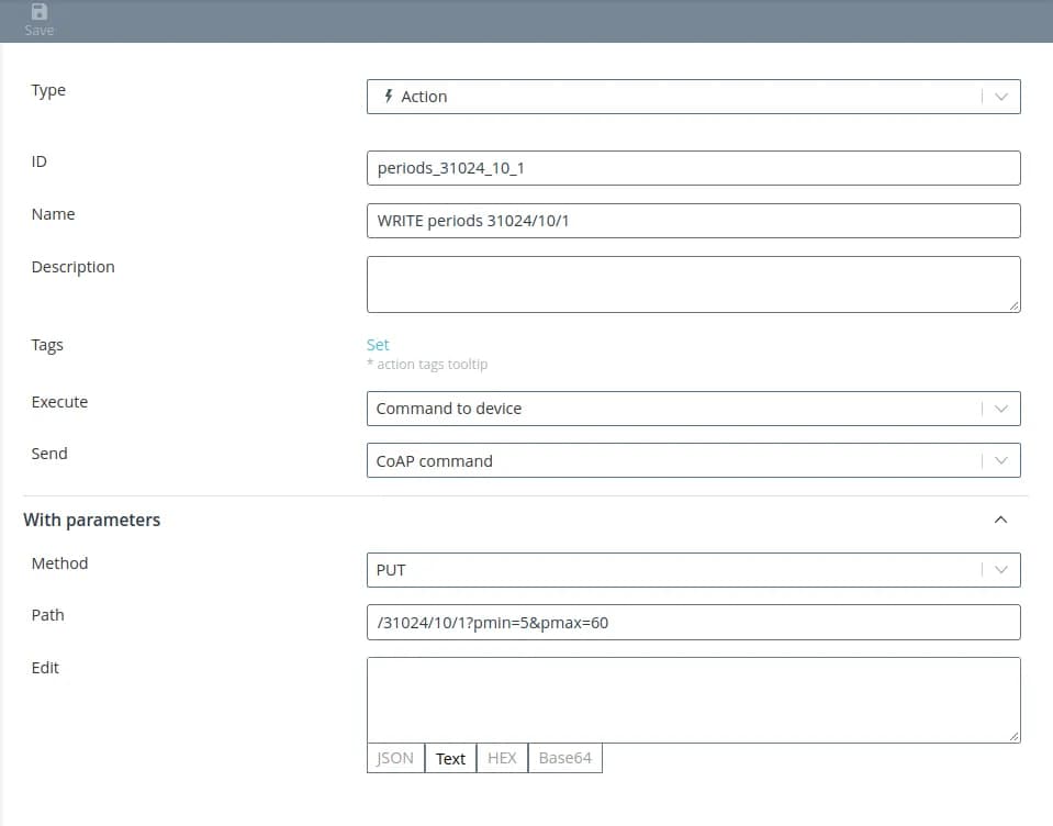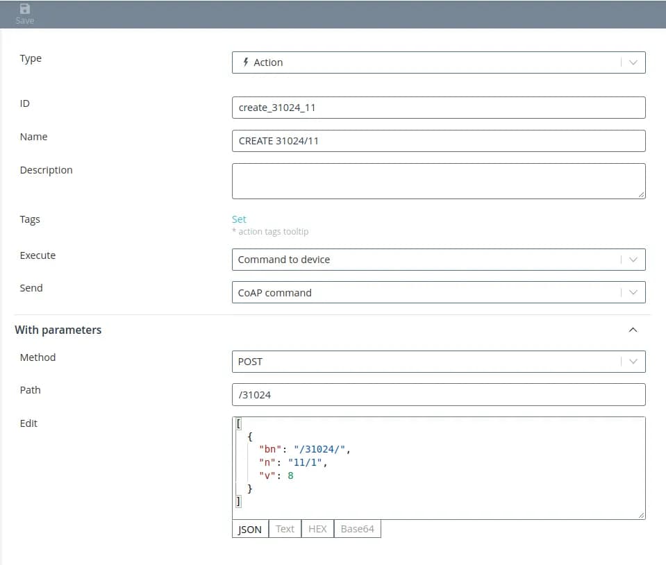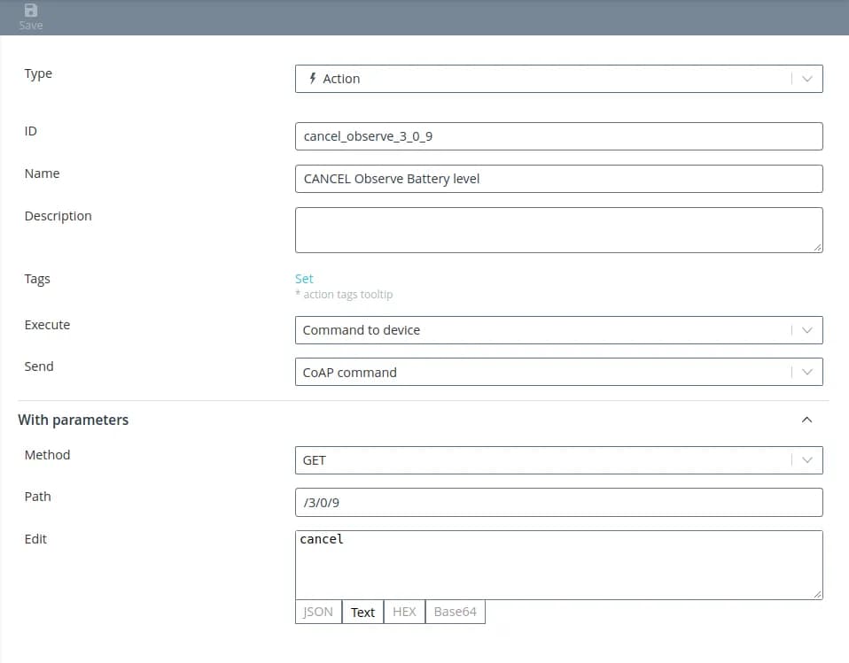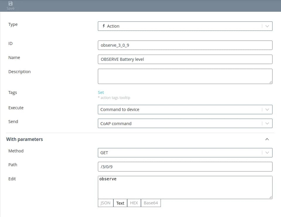 - Observe - set observation. The response from the client must be submitted in SenML JSON format. Specification (opens in a new tab)
