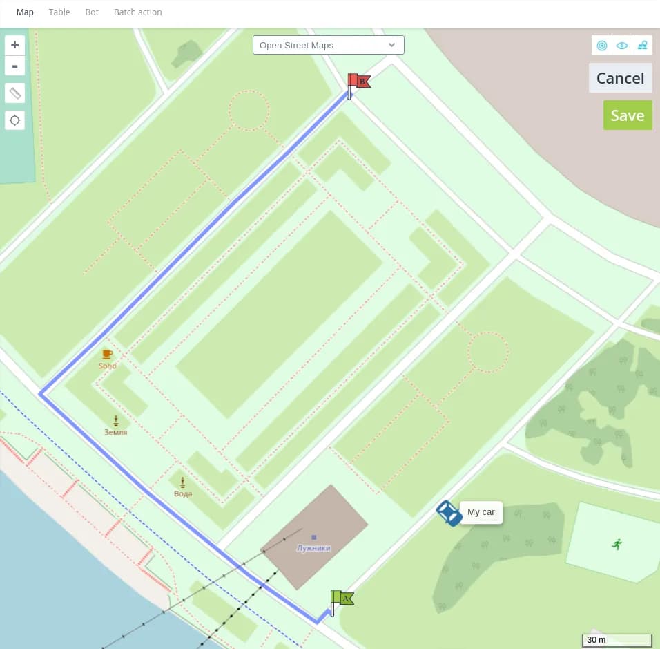 - Set the start and end of the route on the map, after that the system will build the route automatically and offer to save it