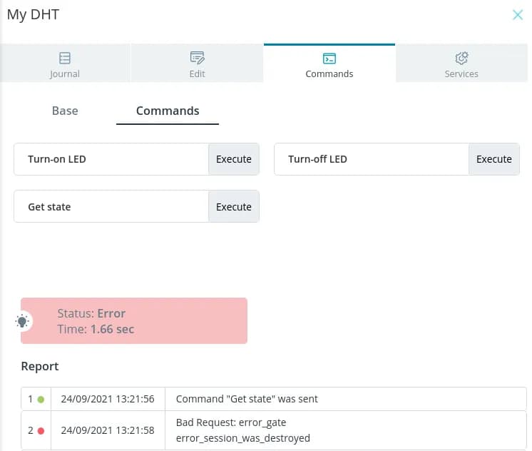 The Commands section displays all commands that can be sent to the device to execute them. After selecting the desired command, press the Execute and the command will be sent to the device. The execution status of the command with requested data (if the command provides a specific response) will be displayed in the same window in the empty part of the workspace below the commands. If the command is formed incorrectly, the command execution time has expired or the device has has switched off, the corresponding error text will be indicated in the execution status.