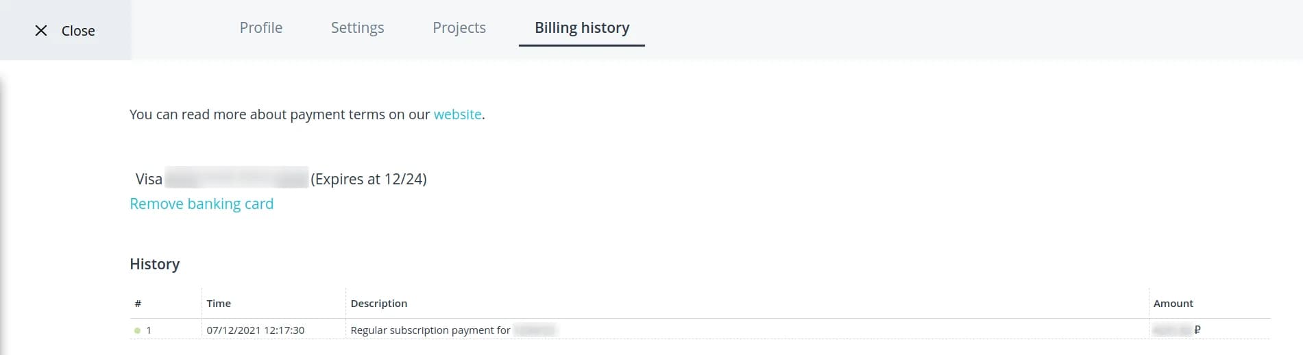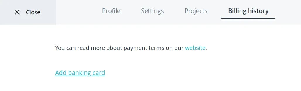 In the Payments section you can add a bank card to pay for licenses for your projects. for your projects. Click the Add Bank Card button.