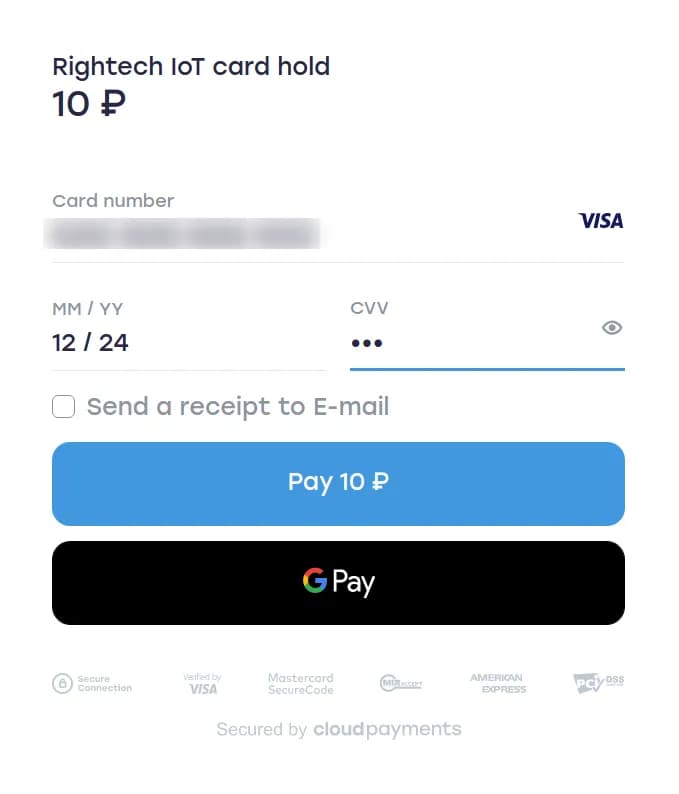 After you click on the payment button and confirm it, your card account will be debited and 10 rubles will be returned.