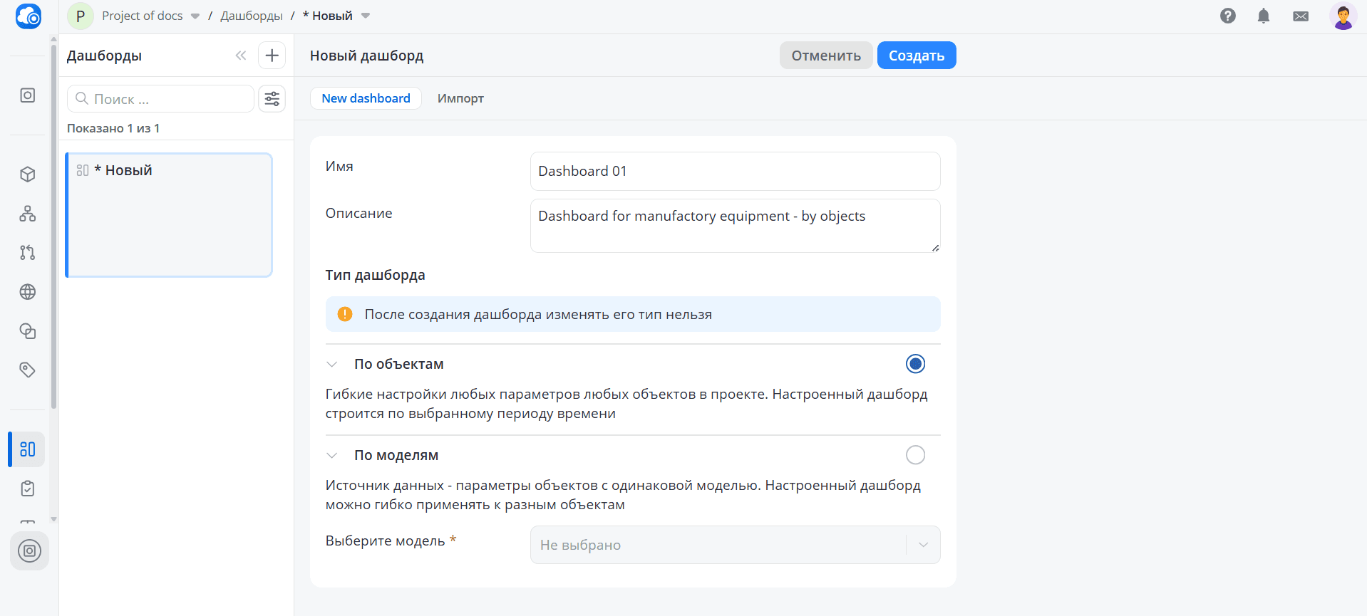 - по моделям - в таком дашборде можно настроить отображение данных объектов с одинаковой моделью, выбираемой при создании дашборда. Дашборд этого типа удобно использовать, когда нужно контролировать параметры большого количества объектов с одинаковой моделью. В этом случае каждый виджет настраивается согласно конкретной модели, а затем к дашборду добавляются необходимые объекты - на каждом виджете дашборда появляются данные по всем выбранным объектам.