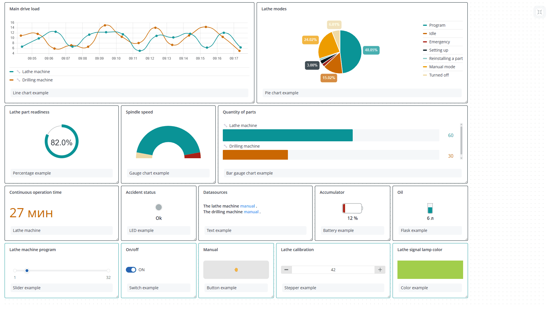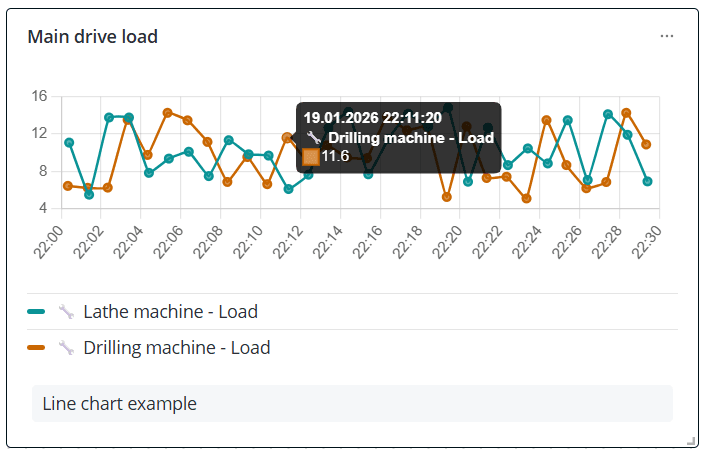 - Линейная диаграмма - график изменения данных во времени. Такой виджет можно использовать для отслеживания температуры, потребления энергии и других показателей датчиков;