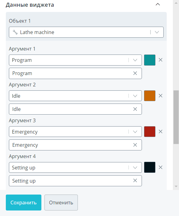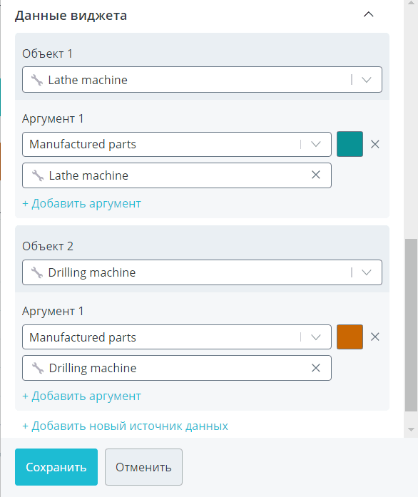 Выберите один или несколько интересующих вас объектов. Для каждого объекта задайте аргументы, значения которых будут использоваться в качестве источников данных. В списке возможных для выбора параметров доступны только те, у которых в модели указан тип данных Число. Суммарно по всем объектам можно добавить до 20 аргументов. Также вы можете переименовать название источника данных и задать свой цвет столбца для каждого аргумента.